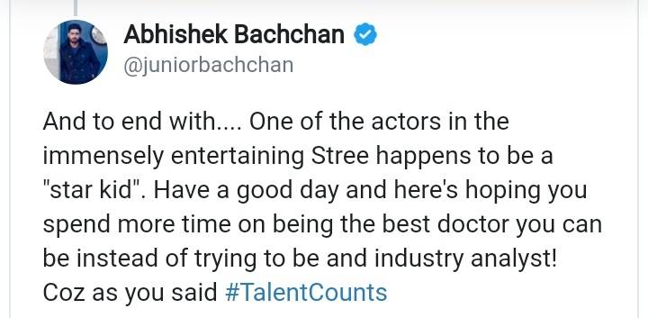 Abhishek soon left a tweet replying, 'With all due respect kind sir, I would expect an esteemed doctor such as yourself to study all the facts and figures before proclaiming anything. I certainly hope you do so with your patients. Learn the economics of the film before you tweet something which will embarrass you.'