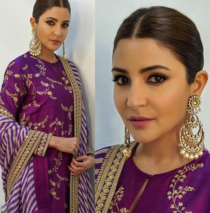 Anushka Sharma is on a promotional spree currently for her upcoming film Sui Dhaaga: Made In India opposite Varun Dhawan. Recently for a promotional event, the actress opted for a purple Sabyasachi suit and how ethereal did she look. With a subtle makeup, Anushka opted for a pair of lovely golden jhumkas with the attire while keeping the hairdo simple with a neat bun. The overall result looked simply stunning.