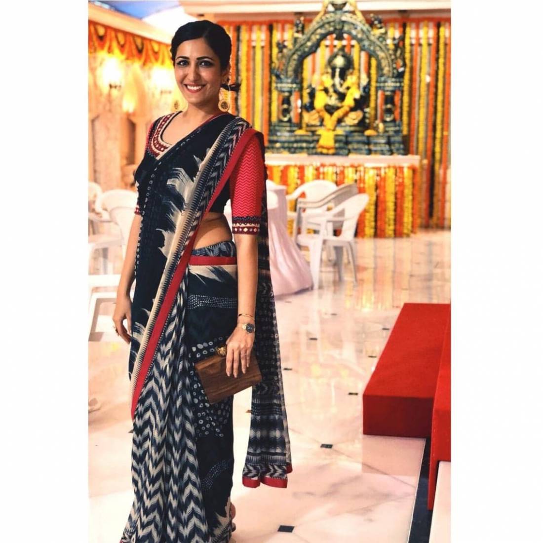 Actress Eisha Chopra looked gorgeous in a Ritu Kumar Sari as she attended the Ganpati Celebrations at Ekta Kapoor's house.