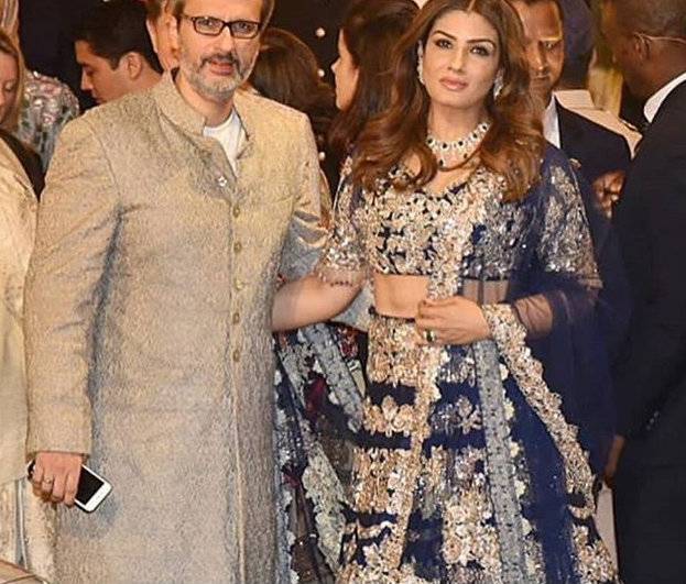 Raveena Tandon looked beautiful in an electric blue lehenga with golden embellishments and a dupatta. She paired the look with her her diamond and emerald accessories.