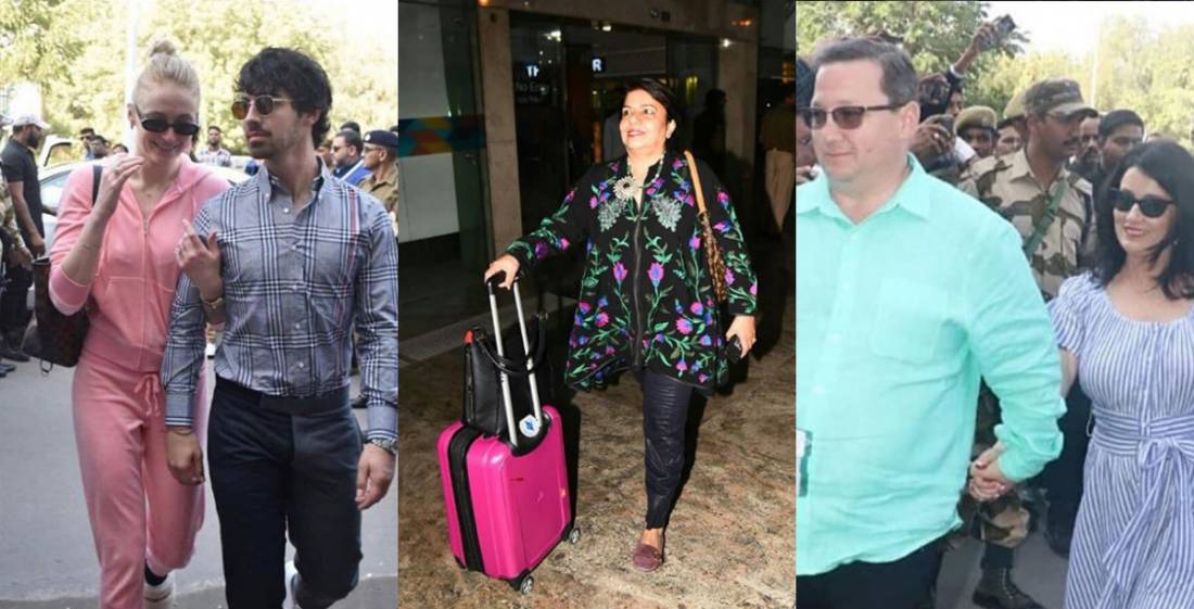 Priyanka Chopra and Nick Jonas were spotted as newlyweds in the Jodhpur airport. Along with them their family members like Nick's parents and his brothers Kevin and Joe along with Sophie Turner and PC's mother Madhu Chopra were also spotted at the airport. They were all headed towards Delhi where the couple will host their reception on December 4th. PM Narendra Modi will also be attending their Delhi reception. Even designer Sabyasachi was spotted at the airport.
