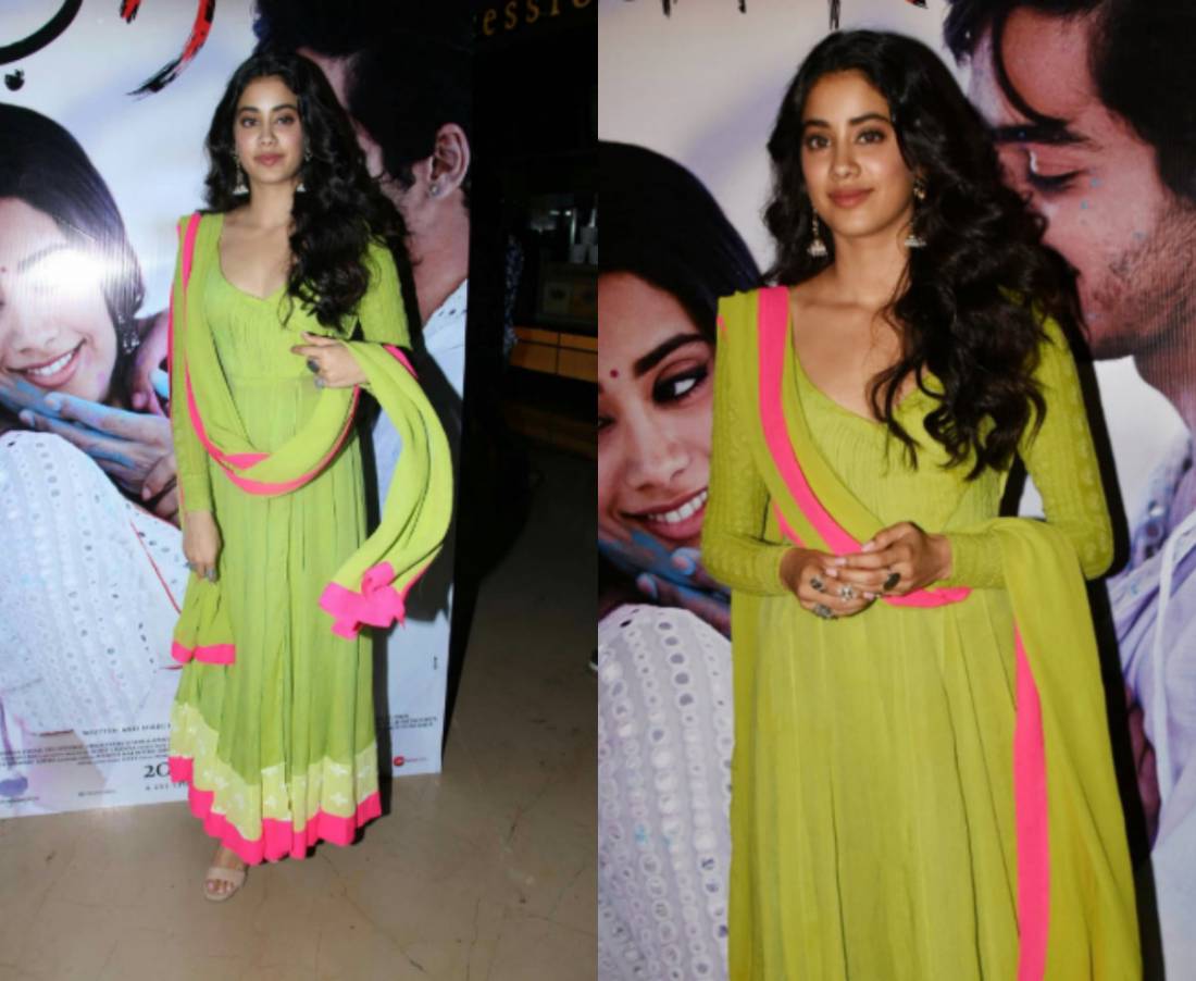 Janhvi had opted for a lime green salwar kameez with a tint of pink. She chose this Manish Malhotra simple ethnic and flowy salwar kameez to stay in the skin of her character. She played a Rajasthani girl in the film and wore traditional and ethnic salwar kameez, kurtas and lehengas in the film designed by Manish Malhotra himself. Her simple trailer launch look reflected her look as Parthivi in the film.