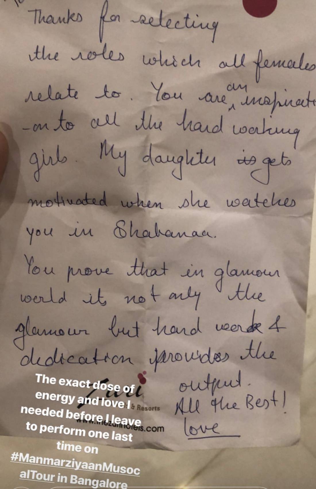 Taapsee Pannu who's currently been touring the nation with her co-stars Abhishek Bachchan and Vicky Kaushal, was in for a warm surprise last evening during their last stop for the Manmarziyaan tour in Bengaluru. Taapsee was staying at a hotel when the hotel staff received a note from a parent of a girl who happens to be a huge fan of the actress. The note was penned by a parent who who expressed their gratitude to Taapsee for etching an inspirational role model from her career choices for young girls to be inspired from. The note read, Thanks for selecting the roles which all females relate to. You are an inspiration to all the hard working girls. My daughter gets motivated when she watches you in Shabana. You prove that in the glamour world its not only the glamour, but hard work and dedication provides the output.