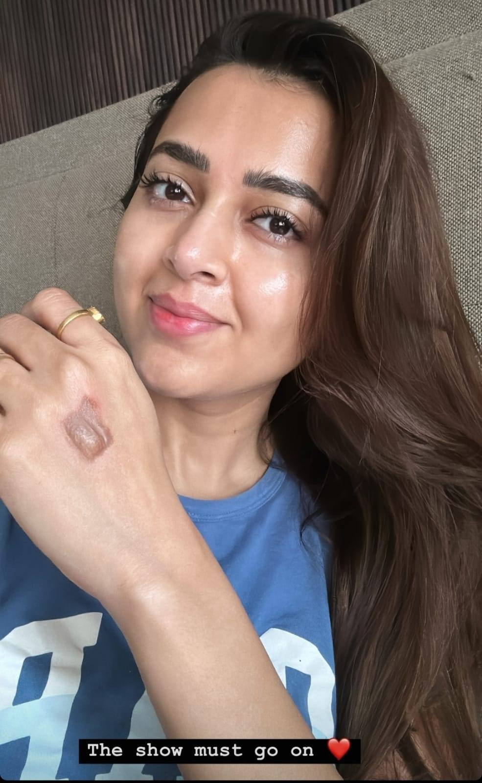 Sharing a glimpse of her injury on Instagram, Tejasswi posted a photo of the burn with the caption, “The show must go on.”