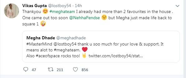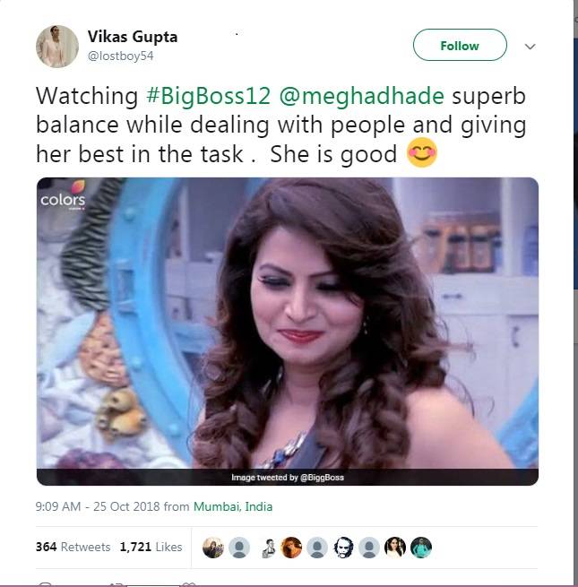 Vikas gupta aka lostboyjourney who got fame as the mastermind of Biggboss himself appreciates Megha for her excellent ability of performing tasks and managing things with people at the BB12 house. Vikas further tweeted that Megha is his favorite contestant of this season.