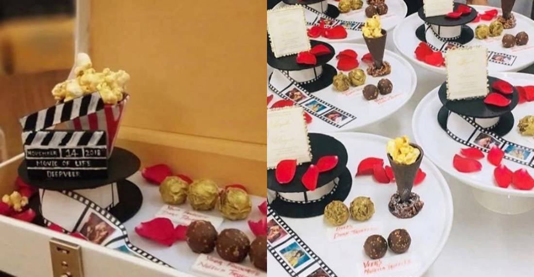 Ranveer Singh's sister Ritika Bhavnani hosted a lavish dinner party for DeepVeer at the Grand Hyatt, Mumbai tonight. The party was thrown to welcome our lovely DeepVeer as newlyweds. The venue was decorated beautifully with the picture of the couple framed into a welcome mat along with a customized box of desserts.